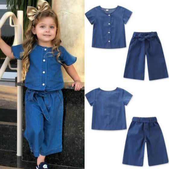 Kids Baby Girls Clothes Flower Off Shoulder Tops Dress Denim Jeans