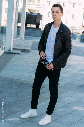 Beautiful Hipster Guy In Stylish Black Clothes And White Shoes