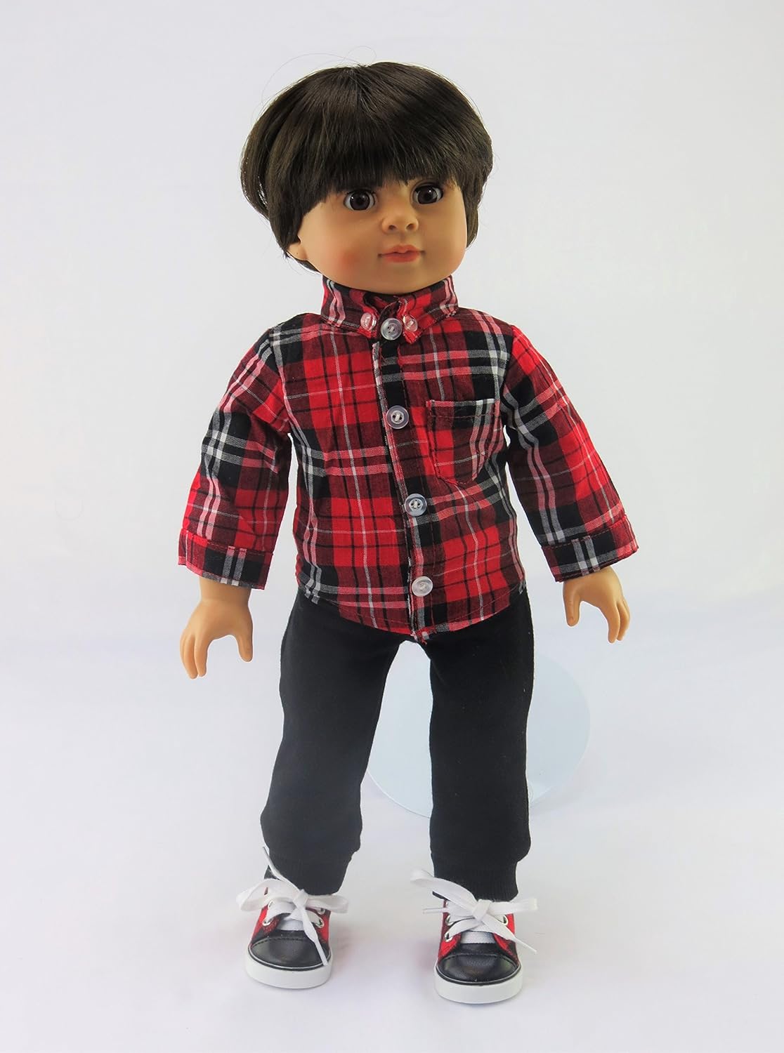 Man In Red Black And Grey Plaid Button Up Jacket With Blue Denim