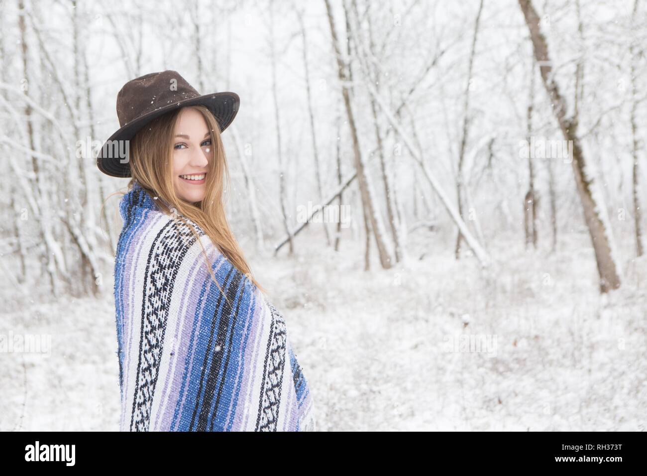 Young Woman In The Snow Wearing A Bohemian Style Blanket And Hat
