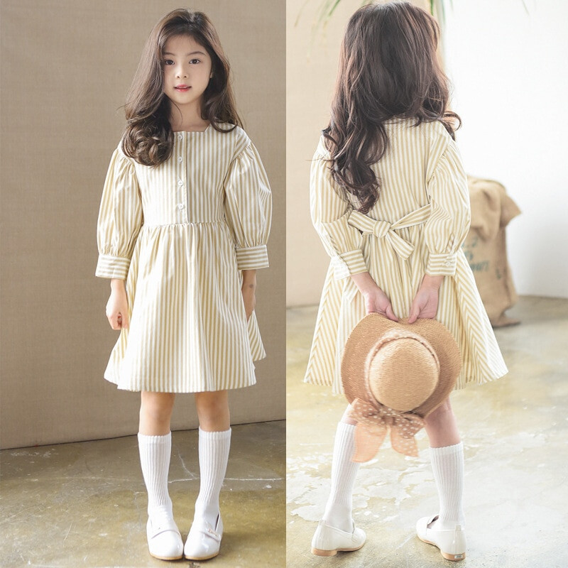 Striped Long Sleeve Girl Dress Bohemian Sundress Retro Dresses