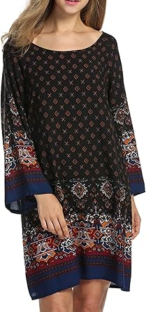 Hotouch Women Shift Dress Bohe Ethnic Style Boat Neck Vintage