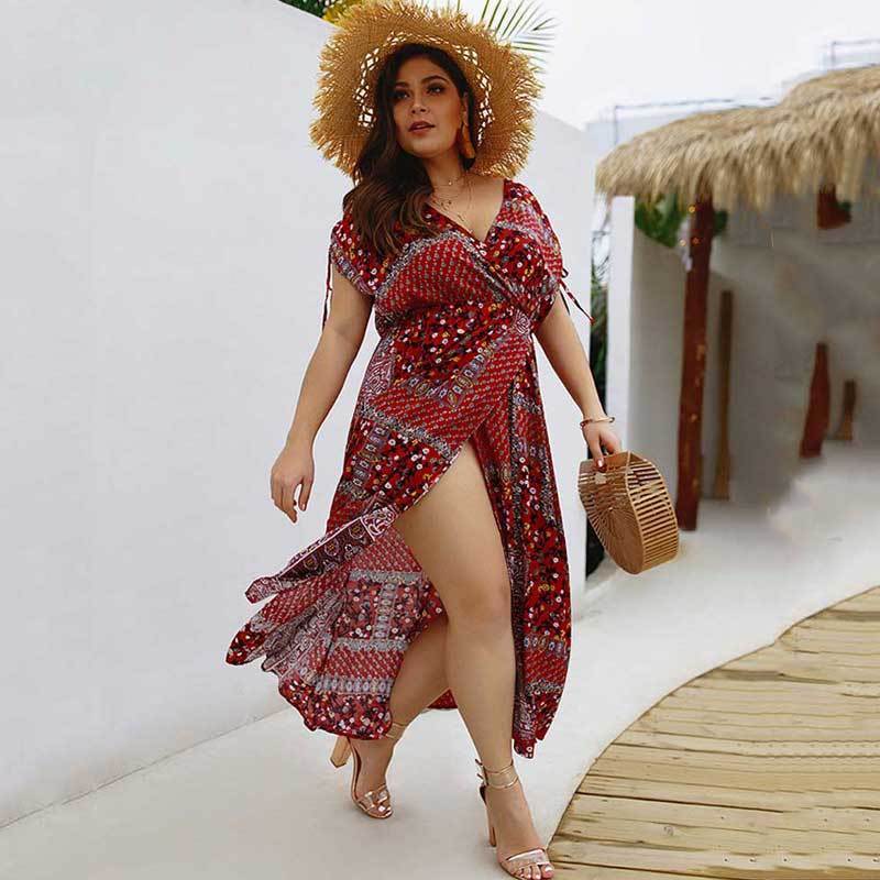 Large Size Women Summer V Neck Lady Plus Size Bohemian Fashion