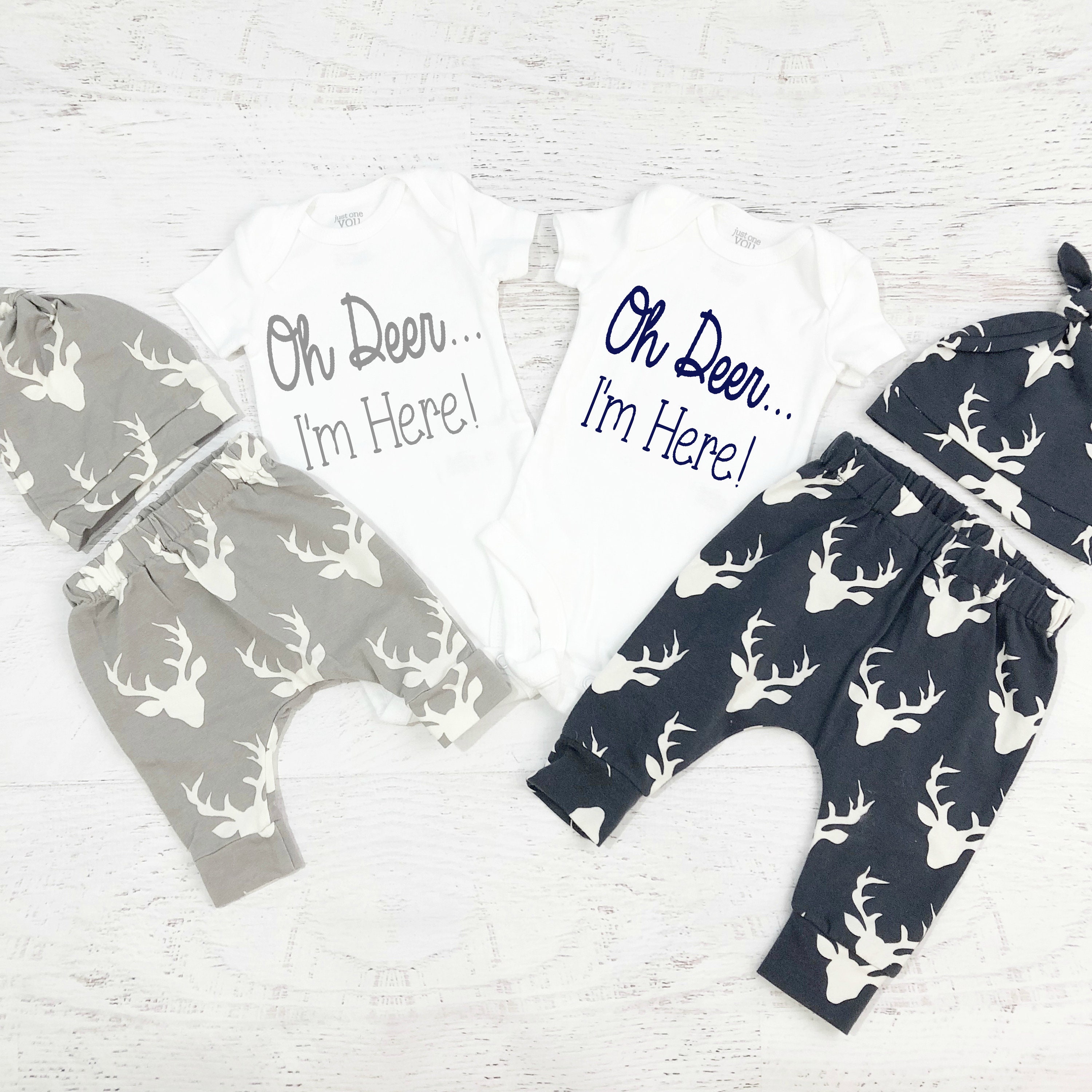 Blue Gray Deer Baby Boy Twins Coming Home Outfit