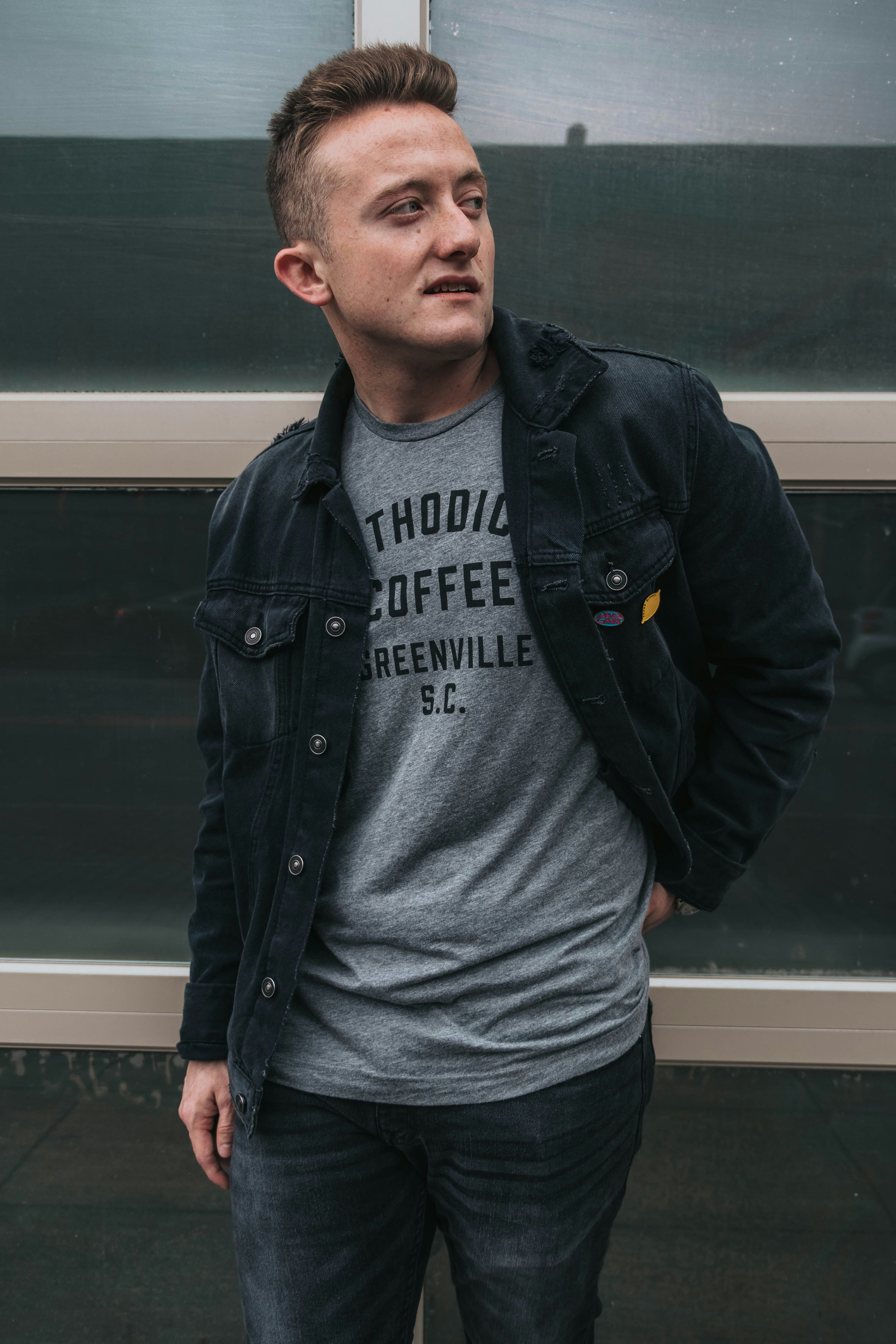 Man In Black Denim Jacket And Faded Green Denim Jeans Standing In