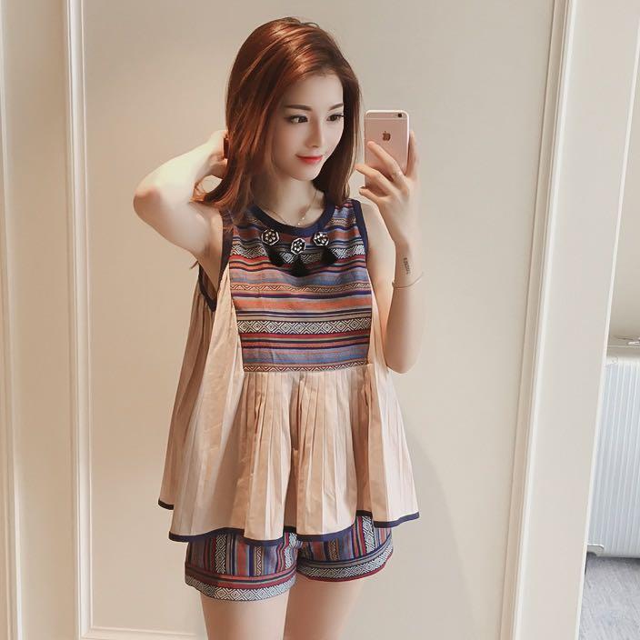 Stripes Bohemian Style Sleeveless Babydoll Top With Matching