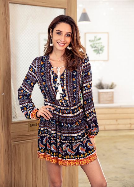 Add Boho Dress Vintage Floral Print Summer Bohemian Dresses V Neck