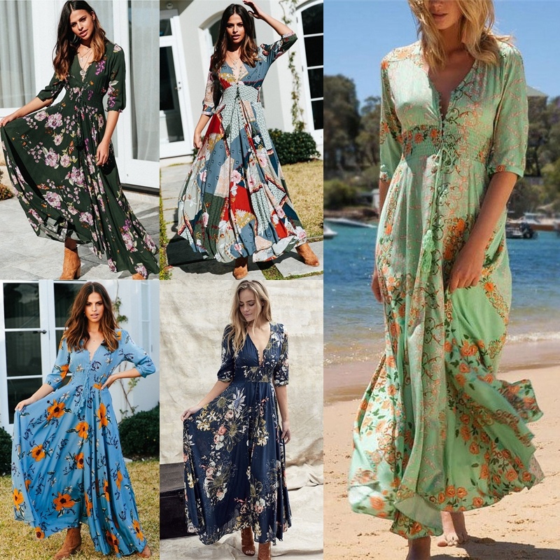 Bohemian Style Deep V Collar Floral Printed Maxi Dress Shopee