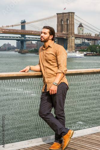 American Man With Beard Traveling In New York Wearing Brown Shirt