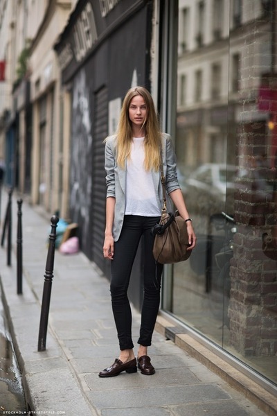 Brown Bags Black Jeans Heather Gray Blazers Brown Clogs White